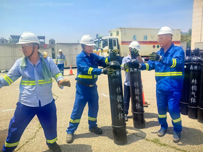 为了在规定时间完成相关任务,北普公司将全部人员分成若干工作小组,组长都是由多次参加重大活动保障任务的老员工担任,小组的主要任务是在规定时间内将钢瓶推放并绑定在指定位置,装表、联管、上枪、调压,充气作业,巡视、加压、换瓶,一个个规范动作都责任到小组到个人,目标只有一个,配合协作单位在规定时间内完成罐装,以最安全的方式、最快的速度将现场高纯氦气钢瓶撤出,确保特制移动笼房能够准时出发。