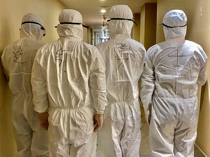 这样的默默坚守,在我们一线服务人员身上更得到充分彰显。在红区工作的13名服务人员,每天要穿着厚厚的防护服为集中观察人员送餐、送物品、搞清洁卫生。每天,他们要全副武装穿上防护服,并严格按照要求进行消杀。要一个房间一个房间地配送餐食,送餐完毕,还要一个房间一个房间地收纳垃圾。由于防护服不透气,刚一行动起来,他们已经浑身是汗,但是他们每次都保质保量按时完成了任务。请记住他们的名字:崔涛、陈宇、翟明星、于艳梅、任艳丽、吴迪、崔加伦、刘克云、孙家俊、单雪芳、杜迪、杨鲁琦、侯迪。